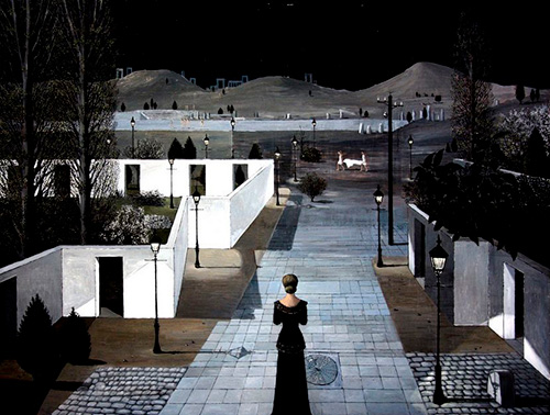 Paul Delvaux, Paysage aux lanternes, 1958 – Huile sur panneau, 120 x 156,5 cm. The ALBERTINA Museum, Vienna – The Batliner Collection